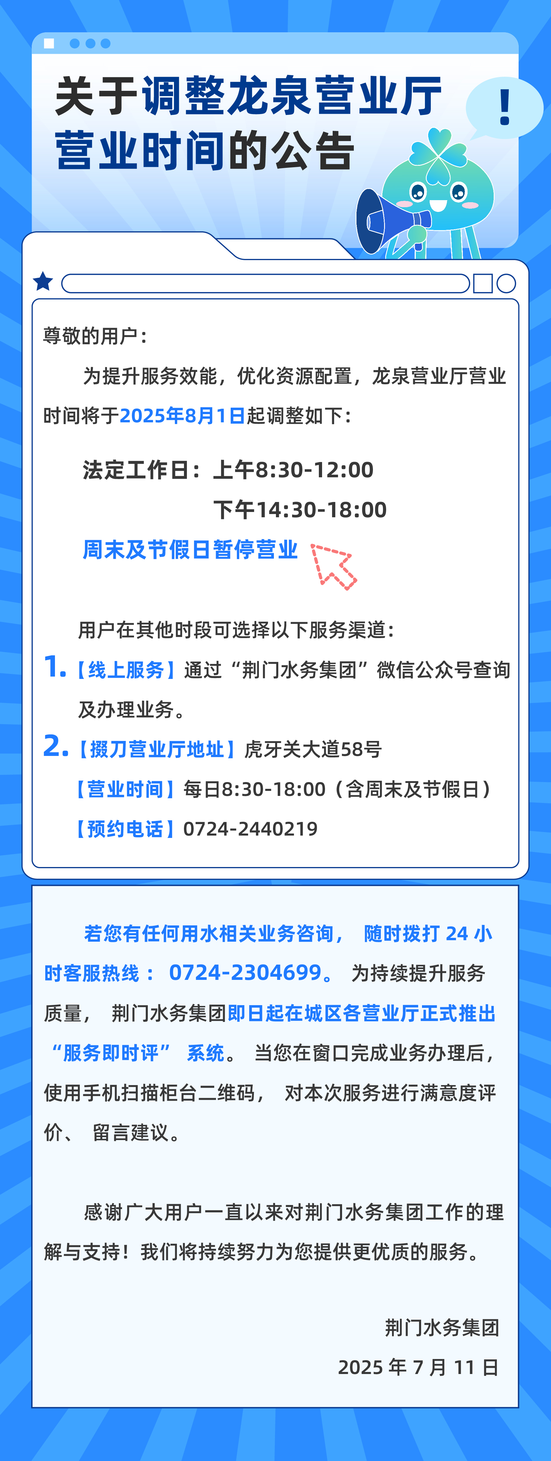 關(guān)于調(diào)整龍泉營業(yè)廳營業(yè)時(shí)間的公告