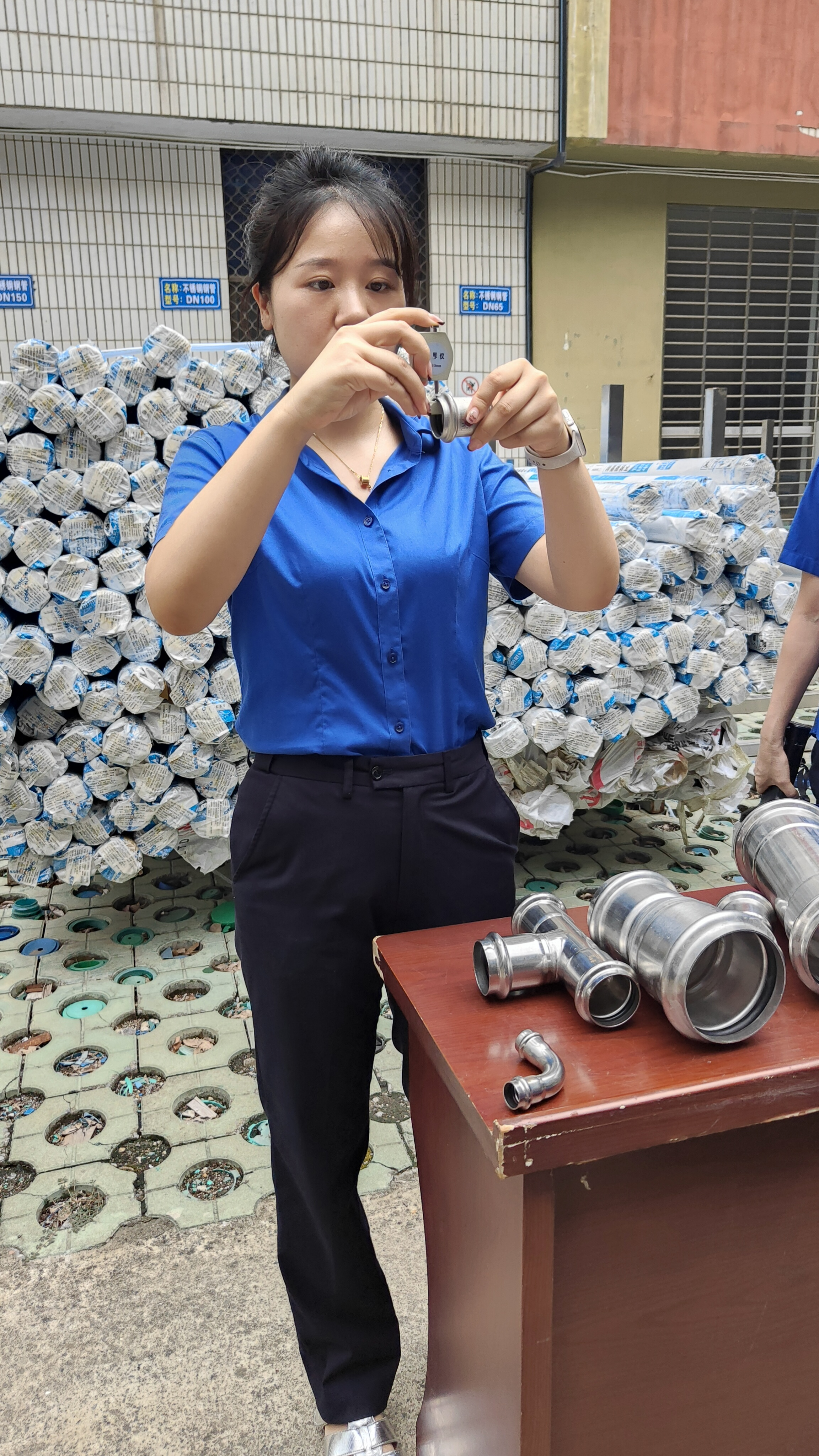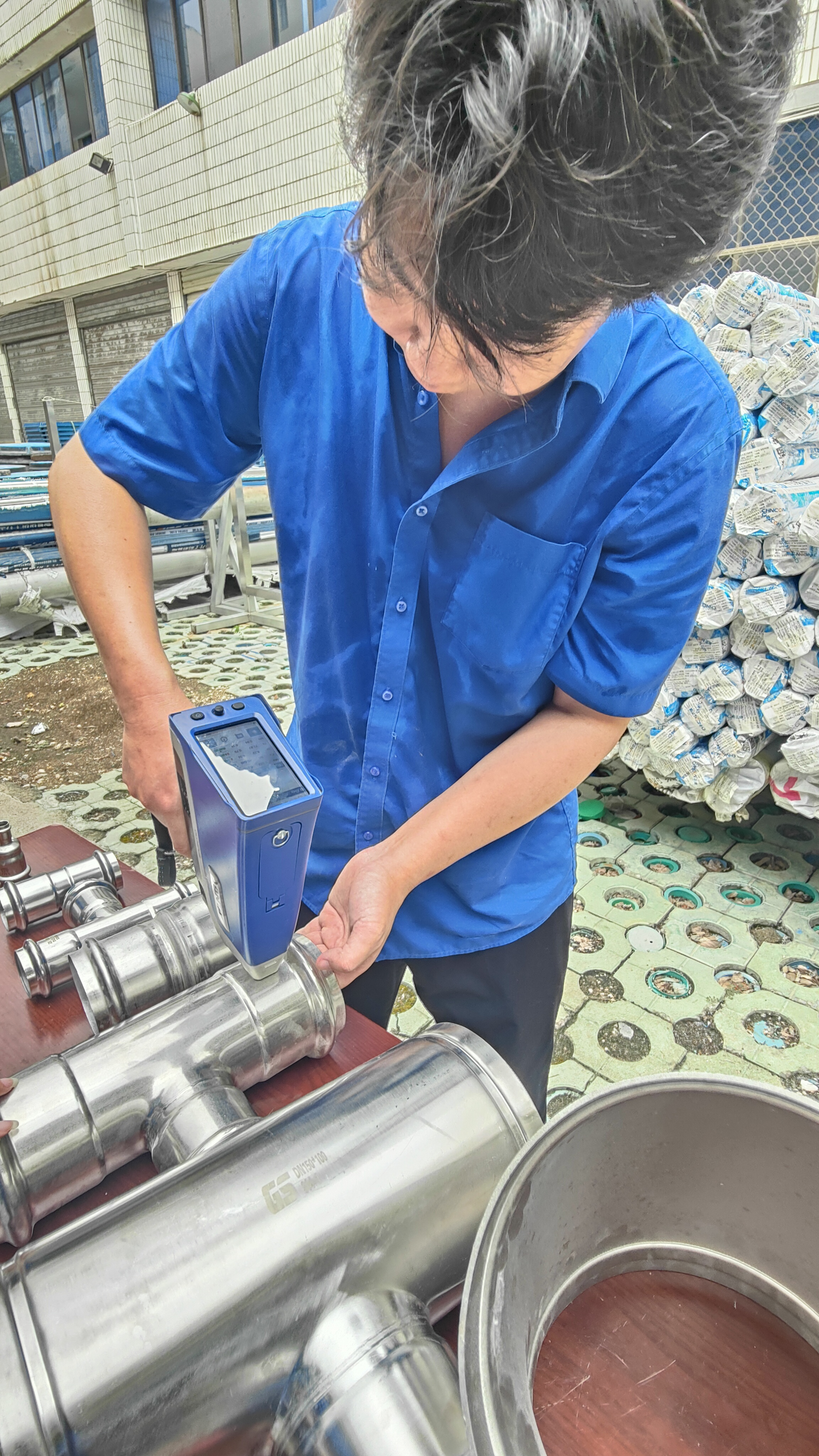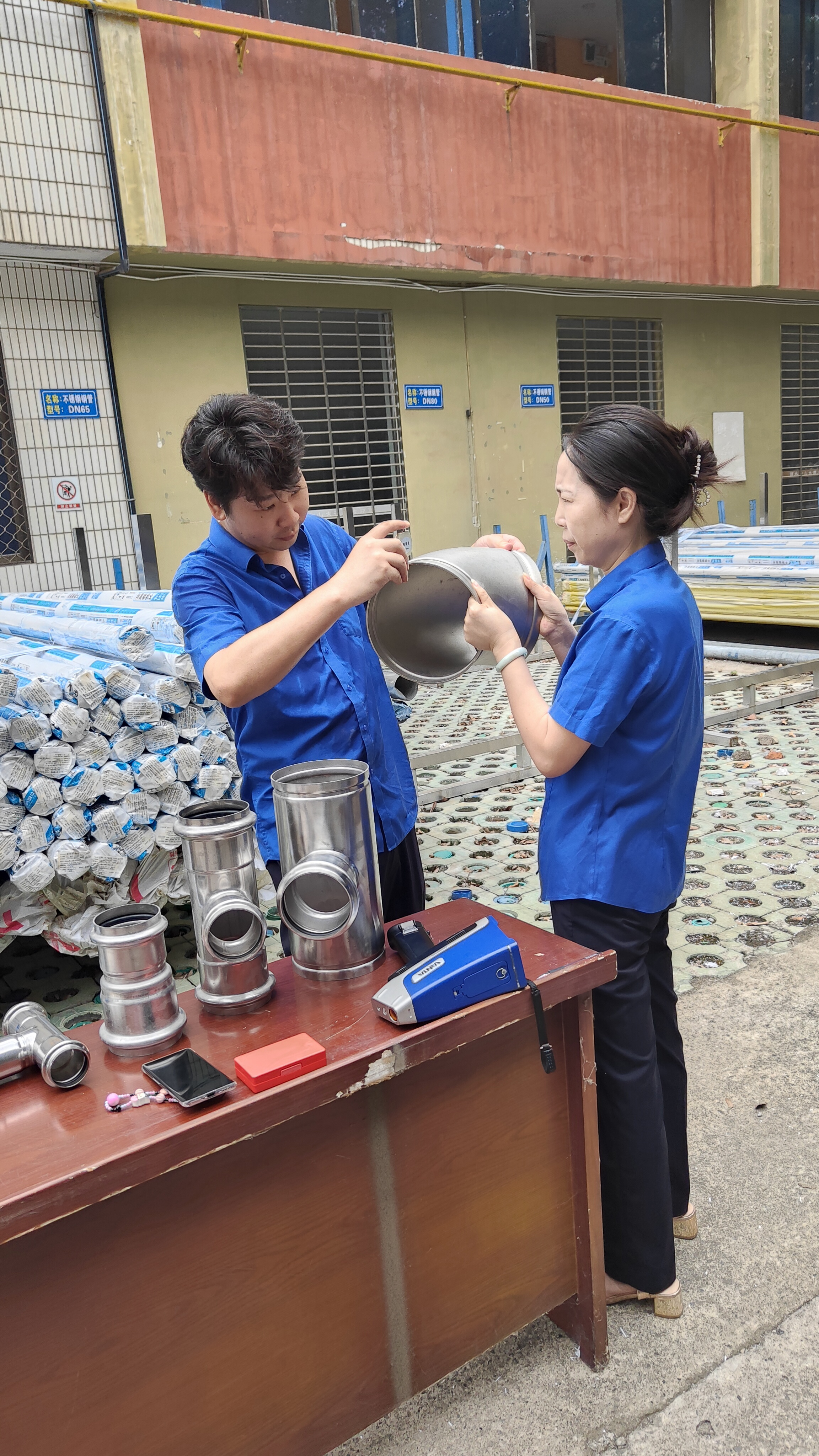 在實操比武環(huán)節(jié),參賽人員按流程對各類型號管件進行鑒別與檢驗:運用手持光譜儀檢測不銹鋼材質成分,確認是否符合不銹鋼304標準;使用測厚儀測量管件壁厚,嚴格把控尺寸偏差;用卷尺測量長度,核對與標準值的誤差。整個比武過程規(guī)范有序,參賽人員嚴謹操作,展現了扎實的驗質功底。